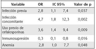 Por el contrario, la presencia de inmunosupresión disminuyó esta probabilidad en un 70% y favoreció la presencia de una infección por KPBLEA- (Cuadro 3).