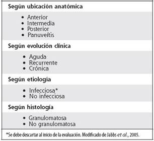 Existen diferentes formas de clasificar la enfermedad uveal, ya sea según su anatomía, duración, presencia o no de granulomas, presencia de infección o asociación con la expresión de alelos de HLA-B27; la nomenclatura actual clasifica las uveítis de acuerdo con el sitio primario de inflamación. El compromiso de la cámara anterior del ojo se categoriza como uveítis anterior e incluye iriditis e iridociclitis. El compromiso del vítero se da en uveitis intermedia e incluye pars planitis. La uveítis posterior describe la inflamación retiniana o coroidea.