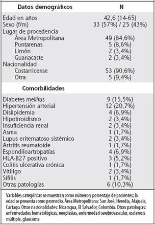 El Cuadro 2 resume las características básicas de los pacientes incluidos en el estudio y sus enfermedades concomitantes. En promedio, fueron referidos a la Clínica de Uveítis del Hospital México 14 casos nuevos por año, provenientes en su mayoría del Área Metropolitana (84,6%). La cifra de pacientes femeninas fue superior a la de pacientes masculinos (57% versus 43%, relación hombre/mujer 1: 1,32). La edad de los pacientes se encontró entre los 14 y 65 años, con una media de 42,6 años.