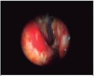 Las lesiones cutáneas clínicamente se observan como nódulos, luego se ulceran y forman placas con una úlcera crateriforme con fondo necrótico y borde violáceo, a menudo cubiertas de costras adherentes,4 como en el caso de este paciente, cuya lesión se encontró en el hélix del oído derecho, sitio de inoculación por el mosquito transmisor. La diseminación del parásito de la Leishmania del nuevo mundo, de la lesión primaria en piel a la mucosa, puede ocurrir en meses o años después de la aparición de la lesión cutánea primaria,3 tal y como se reporta en este paciente, pues ocurre en un periodo de 8 meses. La anatomía vascular de las cavidades nasales y específicamente del septo nasal, favoreció el depósito de parásitos -en este caso la Leishmania-; el depósito de parásitos interfirió con el aporte vascular de las estructuras cartilaginosas, lo que llevó a un deterioro de la estructura comprometida y produjo primero lesiones ulcerosas, y en segunda instancia, lesiones excrementes cicatrizales; dicho proceso fue el resultado a largo plazo de una leishmaniasis cutánea no tratada5 (Figura 1).