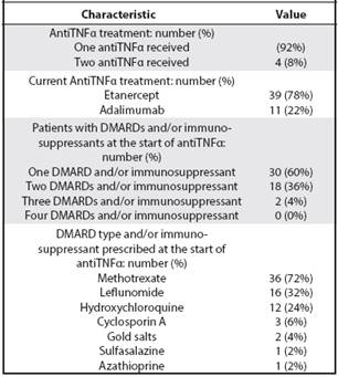 En cuanto a la terapéutica a la fecha del análisis un 78% de los pacientes utilizaron etanercept y 22% adalimumab. El uso de FARME o inmunosupresores al inicio de la terapia antiTNFα fue en promedio de 1.44, siendo el metotrexate el más prescrito. Otros parámetros relacionados con el tratamiento se describen en el Cuadro 1.