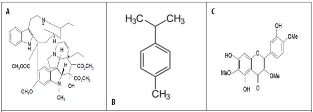 También se determinó la presencia de un alcaloide indólico: la didehidroibogamina (18-metoxicarbonil-3,4), un compuesto incoloro que corresponde al metil-benzeno (monoterpeno:1-isopropil-4), y el flavonoidetrimetoxiflavona (5, 7,3´-trihydroxi-3, 6, 4).