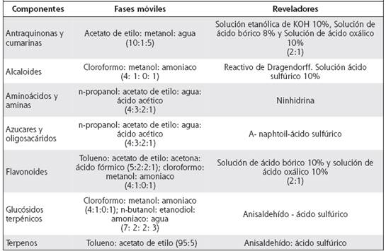 Se pesaron 20 g del extracto seco de albahaca y se disolvió en metanol; después se concentró el volumen de la solución por un rotavapor (Yamato análogo, TSRE300AW, reactivos y equipo S.A de CV, México) durante 30 min, hasta obtener 2mL, de los cuales se tomaron alícuotas de 10μL de cada muestra y se aplicaron a las placas cromatográficas (marca Merck),12, 13 con las distintas fases móviles, según el metabolito por identificar (Cuadro 1).