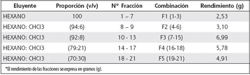Una parte del extracto metanólico se sometió a fraccionamiento primario por cromatografía de columna abierta.7 Se obtuvo un total de 21 fracciones con un volumen de 175 ml cada una, las cuales se asociaron por similitud cromatográfica, obteniéndose 5 fracciones, que se destinaron a las pruebas de hipoglucemia en un modelo experimental de ratas hiperglicémicas. En el Cuadro 2 se muestra el número de fracciones, sus combinaciones y el rendimiento de estas, expresado en gramos.