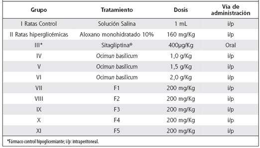 Se utilizaron 44 animales, los cuales fueron subdivididos en 11 grupos, a saber: Grupo I(control): cuatro ratas a las cuales se les suministró 1 mL de solución fisiológica de NaCl + dextrosa, ambas al 0,45% v/v; Grupo II: cuatro ratas: 160 mg/kg de aloxano monohidratado (AM) por kilogramo de peso corporal (PC); Grupo III: cuatro ratas: 160 mg/kg peso corporal de aloxano monohidratado + 400 μg/kg peso corporal de sitagliptina®; Grupo IV: cuatro ratas: 160 mg/kg peso corporal de aloxano monohidratado (AM) + 1,0 g/kg de PC del extracto metabólico de albahaca (EMA); Grupo V: cuatro ratas: 160mg/kg PC de AM + 1,5 g/kg PC del extracto metanólico de albahaca; Grupo VI: cuatro ratas: 160 mg/kg PC de AM + 2,0g/kg PC del extracto metanólico de albahaca; Grupo VII: cuatro ratas: 160 mg/kg PC de AM + 200 mg/kg PC de la fracción 1; Grupo VIII: cuatro ratas : 160 mg/kg PC de AM+ 200 mg/kg PC de la fracción 2 ; Grupo IX: cuatro ratas: 160 mg/kg PC de AM + 200 mg/kg PC de la fracción3; Grupo X: cuatro ratas: 160 mg/kg PC de AM + 200 mg/kg PC de la fracción 4; Grupo XI: cuatro ratas:160 mg/kg PC deAM + 200 mg/kg PC de la fracción 5. El Cuadro 3 muestra la distribución de los grupos. Todos los tratamientos fueron aplicados por vía intraperitoneal y los correspondientes a los grupos II al XI fueron disueltos en polisorbato sódico 80. (Tween 80) al 5% v/v en agua destilada. La frecuencia de administración fue cada 24 h durante 5d.