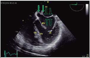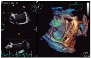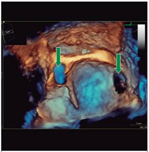 Se realiza ecocardiograma transtorácico (ETT) y transesofágico 3D (ETE) en equipo GE Vivid E9, que documentó una función sistólica biventricular conservada con fracción de eyección del 60% e insuficiencia mitral leve. En la aurícula izquierda se evidencia una membrana que lo divide en dos cavidades: una superior, de 18,8cm2 y otra inferior, de 11,1cm2. Se evidencia dos orificios en dicha membrana; uno lateral 1,3cm2 y otro medial de 1,2cm2, las cuales no generan un gradiente significativo con la interrogación Doppler. No se evidencian anormalidades del septum interatrial, ni el interventricular. Se registra una presión sistólica de la arteria pulmonar pico de 43 mmHg, con presión arterial pulmonar media 25 mmHg. La velocidad a través de los orificios no excedía los 1,3 m/s, lo que equivale a un gradiente menor de 10 mmHg.