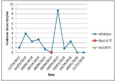 A 10-year-old boy with neurofibromatosis type 1 and severe hemophilia A developed FVIII inhibitors at age 3 in 2010. He was previously treated with on demand FVIII therapy at the national hemophilia treatment center, where high response inhibitors were documented. He was then transferred to our hospital in 2013 after a bleeding during a dental extraction, due to social problems. In that occasion he required a blood transfusion and high doses of FVIII. Even though our patient was very active he used to bleed no more than 2 or 3 times per year. In our center low response inhibitors were detected in 2014, but it was not until September 2015 when ITI could be started. Inhibitor titer at the initiation of ITI therapy was negative and the level of FVIII was 1.75%.