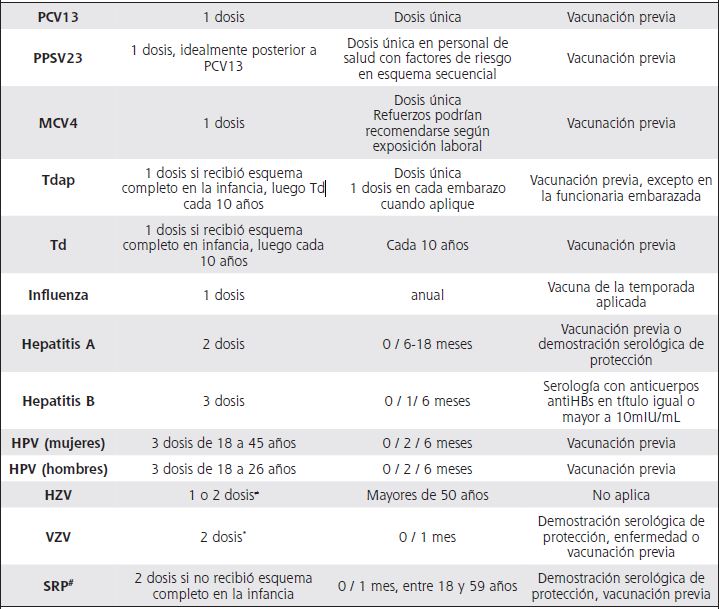 Objetivos: concatenar los esquemas de vacunación recomendados actualmente para los funcionarios que laboran en centros de salud y ofrecer una guía adaptada a la realidad epidemiológica nacional.