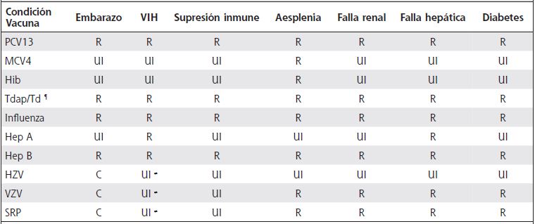 El Cuadro 2 resume las principales recomendaciones de vacunación para trabajadores sanitarios portadores de condiciones especiales como: embarazo, infección con virus de inmunodeficiencia humana (VIH), estados de inmunosupresión, aesplenia funcional o anatómica, disfunción renal o hepática y diabetes mellitus.