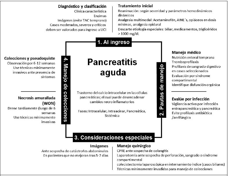 El manejo de la pancreatitis aguda requiere un conocimiento adecuado del fenómeno clínico y fisiopatológico subyacente del paciente. La evaluación secuencial, el diagnóstico adecuado y el tratamiento óptimo y oportuno favorecen un adecuado desenlace clínico y se asocian con menor desarrollo de complicaciones, morbilidad y mortalidad.