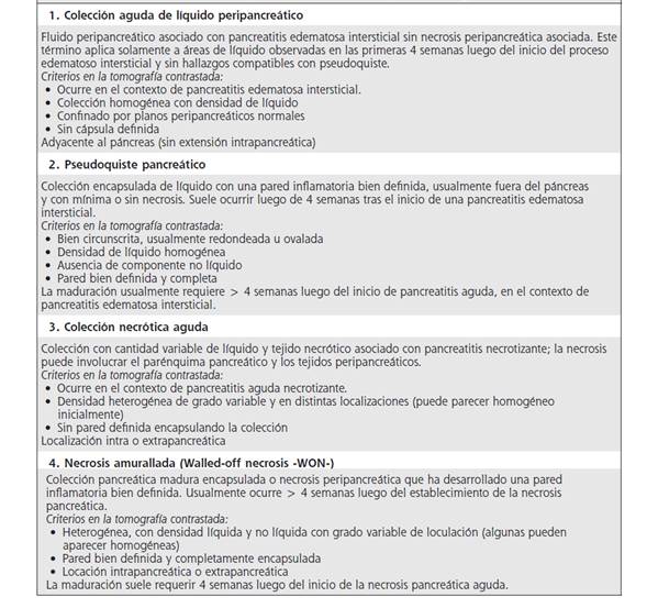El diagnóstico de pancreatitis incluye en sus criterios la presencia de imágenes compatibles con el diagnóstico.5 La clasificación de Atlanta de 1992 define morfológicamente las pancreatitis agudas y las colecciones pancreáticas y peripancreáticas en la tomografía computarizada (Cuadro 1),44 sin embargo, estos estudios rara vez se justifican en los primeros días y su realización tardía se asocia con mejor certeza diagnóstica,45 ya que en los primeros 3-4 días son poco confiables en la detección de la extensión de la necrosis y la presencia de colecciones, por lo que solamente se debe realizar en los casos en que se sospechen catástrofes abdominales (como perforación, sangrado, isquemia), los que presentan abdomen agudo (sin que esto retrase la evaluación quirúrgica), o los que no mejoran tras 5-7 días de inicio de tratamiento.3,46