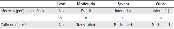 Desde el punto de vista morfológico, la pancreatitis aguda se clasifica en dos tipos: pancreatitis edematosa intersticial y pancreatitis necrotizante (Cuadro 1).6 De acuerdo con severidad, hay 4 categorías de pancreatitis aguda (Cuadro 2).42 La división de los casos de pancreatitis aguda en leves, moderados, severos y críticos, tiene implicaciones pronósticas y de manejo sumamente importantes, ya que la mortalidad asociada con pancreatitis leve oscila alrededor del 1 %, mientras que supera el 35 % en pancreatitis severa y crítica.3 El balance entre factores proinflamatorios / antiinflamatorios y entre lesión por necrosis / apoptosis, es uno de los determinantes de la severidad en un paciente individual.11