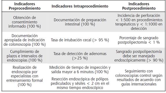 Para colonoscopia, los indicadores de calidad prioritarios son una TDA mayor al 25 %, una intubación cecal mayor al 95 % y el uso correcto de los intervalos recomendados para el tamizaje y seguimiento del cáncer colorrectal. Estos 3 indicadores se asocian a desenlaces clínicos de gran relevancia y, por lo tanto, deben ser monitoreados estrictamente.