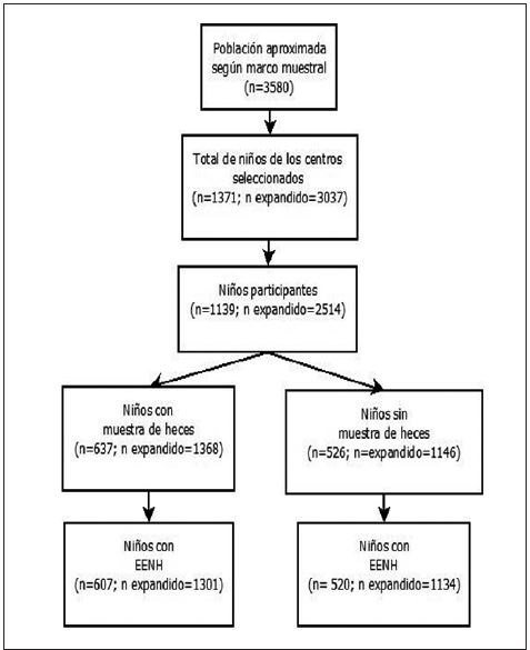 Se recolectó heces de 637 niños (n expandido=1368); 593 niños (n expandido= 1279) entregaron una única muestra de heces y 44 niños (n expandido=89) entregaron 2 muestras (recolectadas en diferentes días). Para ello se les explicó a los padres o encargados de los niños de forma oral y escrita cómo recolectar las muestras de heces de los niños y se les entregó un frasco plástico de boca ancha estéril. Las muestras fueron transportadas a temperatura ambiente al Laboratorio de Helmintología Médica de la Facultad de Microbiología de la Universidad de Costa Rica, donde fueron analizadas, en un periodo <4 horas.