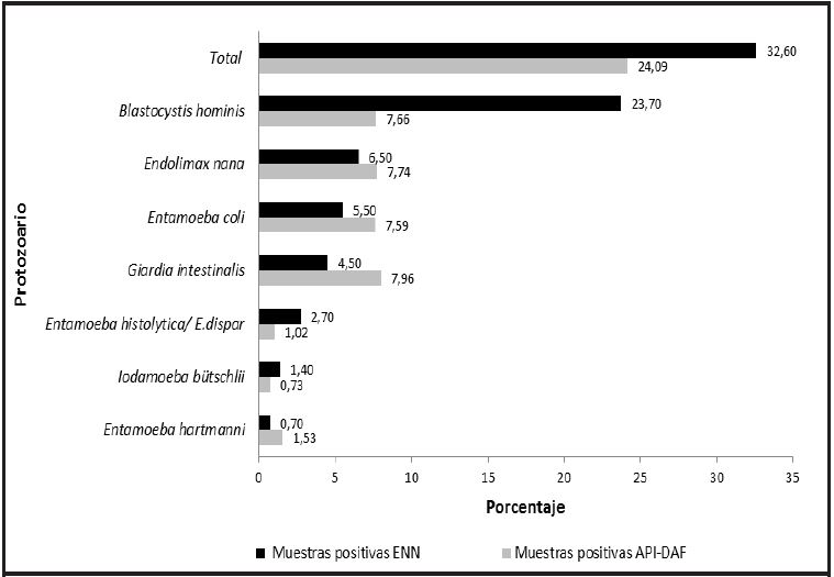En el estudio actual, se encontraron 103 (7,5%) muestras con 2-4 protozoarios comensales, 54 (3,8%) muestras con protozoarios comensales y protozoarios patógenos y 6 (0,4%) muestras con infecciones mixtas por protozoarios y helmintos. Giardia intestinalis fue el protozoario de mayor prevalencia en infantes de 2 años, Entamoeba coli fue el más frecuente en niños de 3, 6 y 7 años y Blastocystis hominis fue el más frecuente en niños de 4 y 5 años (datos no mostrados).