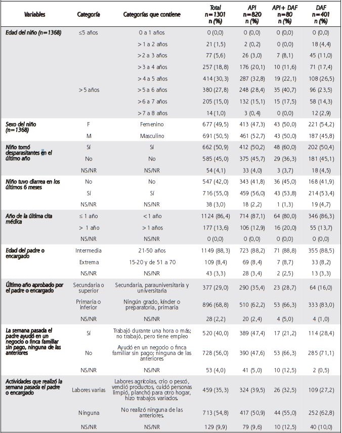 En el Cuadro 1 se resumen algunas de las características socioeconómicas de los niños que participaron en el estudio y sus familias. Las familias de los niños estudiados, a pesar del nivel económico bajo (según su criterio de selección para ser beneficiarios de API o DAF), tenían en su mayoría acceso a condiciones sanitarias básicas (agua entubada hasta el hogar, no tener piso de tierra y uso de antiparasitarios) ((Cuadro 1).