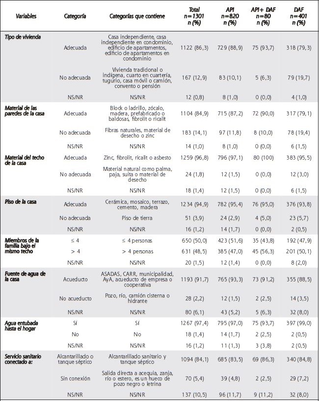 A los padres o encargados de los niños se les aplicó una parte de la Encuesta Nacional de Hogares de Costa Rica (ENAHO) de 2014,21 denominada de acá en adelante Extracto de la Encuesta Nacional de Hogares (EENH). Con esta encuesta se recolectó información sociodemográfica (i.e., edad del niño, sexo), información sobre las condiciones de la vivienda de la familia (i.e., tipo de vivienda, material de las paredes de la casa, material del techo de la casa, miembros de la familia bajo el mismo techo), de las condiciones sanitarias (i.e., fuente de agua de la casa, conexión del servicio sanitario), de educación y trabajo del padre o encargado (i.e., edad del padre o encargado, último año de estudio aprobado por el padre o encargado, tipo de trabajo realizado por el padre o encargado la semana anterior) y sobre salud del niño (i.e., si el niño tomó desparasitantes en el último año, si el niño tuvo diarrea en los últimos 6 meses y año de la última cita médica del niño). Las variables se operacionalizaron como variables dicotómicas, cuya clasificación se observa en el Cuadro 1.