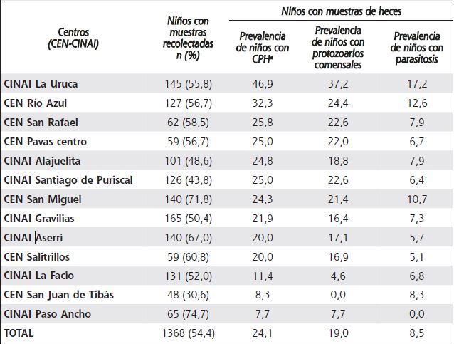 Conclusions: The CPH prevalence found in this study was lower than the one observed in the Costa Rican National Nutritional Survey 2008-2009 (32.6%). However, this study shows that there are several permissive conditions that allow the transmission of intestinal parasites and that it is necessary to improve the preventive and treatment measures of intestinal parasites.