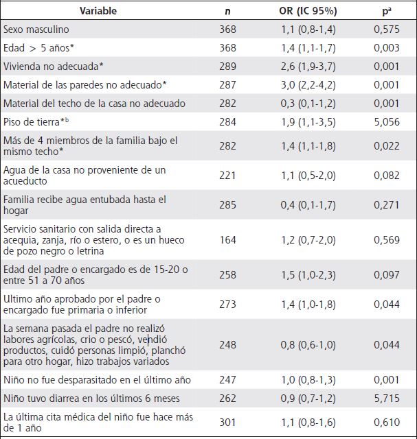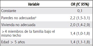 En el Cuadro 3 se presentan los resultados de los análisis bivariados de las características socioeconómicas con la presencia de CPH. Se observó que el vivir en una casa con una pared de material de desecho o zinc (OR=3,0, IC 95%: 2,2-4,2), vivir en una vivienda no adecuada [i.e., vivienda indígena, cuarto en cuartería, tugurio, casa móvil, pensión o convento (OR=2,6, IC 95%: 1,9-3,7)), vivir en una casa con piso de tierra (OR=1,9, IC 95%:1,1-3,5), tener una familia con más de 4 miembros (OR=1,4, IC 95%: 1,1-1,8) y una edad >5 años (OR=1,4, IC 95%:1,1-1,7) se asociaban con la presencia de CPH.
