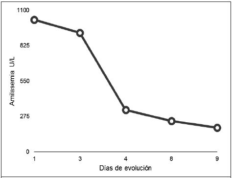 Por lo anterior, se decidió no colocar la quimioterapia indicada e inmediatamente se trasladó al Servicio de Emergencias, donde se le realizó laboratorios que documentaron anemia en 8,1mg/dL normocítica normocrómica, con leucocitos en 6,590/uL, neutrófilos absolutos en 5417/uL y plaquetas en 288,000/uL, amilasemia en 1027U/L, hipocalcemia en 2,1mg/dL, hipokalemia 2,2mEq/L y deshidrogenasa láctica aumentada en 518IU/L. Proteína C reactiva, transaminasas, y pruebas de función renal, dentro de parámetros normales.
