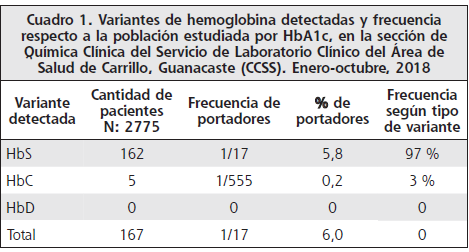 En la sección de Química Clínica del laboratorio clínico del Área de Salud de Carrillo, se realizan determinaciones de hemoglobinas glicosiladas, cuyo método permite detectar a la vez la presencia de variantes de hemoglobina, observándose una frecuencia del 6,0 % de variantes de hemoglobina.