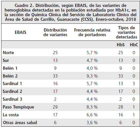 Resultados: En 2775 pacientes examinados por hemoglobina A1c, 167 (6,0 %) fueron portadores de variantes de hemoglobina, con una frecuencia de 1/17, en donde el 97 % correspondió a heterocigotos para hemoglobina un 3% a heterocigotos para hemoglobina C y ninguno para la variante D. La presencia de variantes se observó en los 9 equipos básicos de atención integral en salud del área. La distribución de portadores por equipo básico de atención en el Área de Salud de Carrillo varió de un 4,0 % a un 9,3 %.