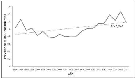 La prevalencia encontrada en el análisis fue de 1,02 x 1000 nv (IC95 %: 0,97-1,07), y está dentro de la reportada por las principales redes de vigilancia de defectos congénitos.3-7