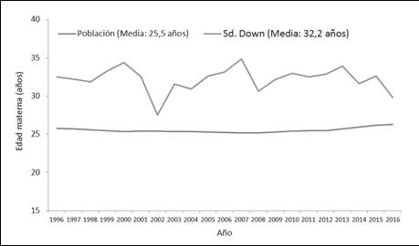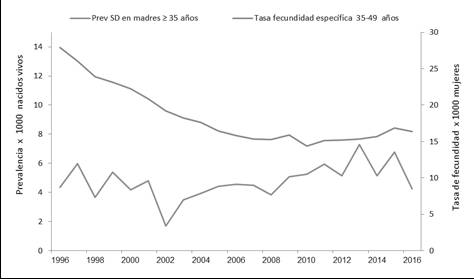 Results: For 1996-2016 the prevalence of Down syndrome in live births was 1.02 x 1000 (95% CI: 0.97-1.07). There was a significant increase from 0.91 (1996-2007) to 1.16 x 1000 (2008-2016), at the expense of the prevalence in mothers ≥35 years, which increased from 4.27 to 5.44 x 1000; while the fertility rate in these mothers fell significantly from 20.15 x 1000 (95% CI: 20.02-20.28) in 1996-2007, to 15.58 x 1000 (95% CI 15.46-15.70) in 2008-2016. Maternal age mean MS in SD was 32.2 years, versus 25.5 years in the general population (p≤0.001). The prevalence ratio adjusted by period, in mothers of ≥35 years, against mothers of 20-34 years was of 8.05 (95% CI 7.25-8.95) and the population attributable fraction was 41.22%.