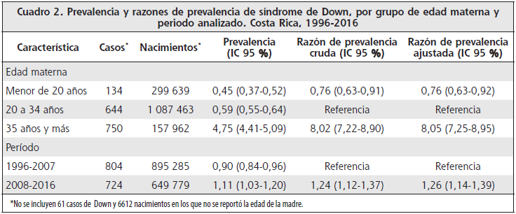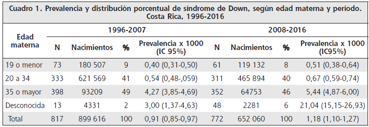 Conclusions: The livebirth`s prevalence of Down syndrome in Costa Rica increased for the study period, at the expense of prevalence in mothers ≥35 years, although the specific fertility rate in these women fell significantly. The inclusion of the National Children’s Hospital - as a national reference institution for this syndrome - within the surveillance network of congenital defects, could be a determining factor in in prevalence rise.