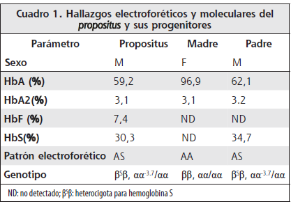 Se trata de un paciente masculino, quien al cuarto día de nacido se diagnosticó como portador heterocigoto para HbS, patrón FAS obtenido mediante electroforesis de hemoglobina por HPLC, realizado como parte del tamizaje por hemoglobinopatías, perteneciente al Programa Nacional de Tamizaje Neonatal de Costa Rica, de la Caja Costarricense de Seguro Social. A partir de ese momento, el niño es referido al Servicio de Hematología del Hospital Nacional de Niños Dr. Carlos Sáenz Herrera, para su seguimiento y control. Al año de vida, se decide efectuar estudios por presentar anemia asintomática, pero persistente, desde los 6 meses de dosis de 5mg/kg/día, durante un período de 4 meses. Entre los antecedentes heredofamiliares, se conoce al padre como portador heterocigoto para HbS (establecido al momento del diagnóstico del niño durante el tamizaje neonatal y como parte del mismo programa en donde se tamiza también a los progenitores para determinar patrón hereditario), y además, tanto el padre como el tío paterno poseen una historia de anemia persistente sin causa aparente. La madre era conocida sana, y en la electroforesis realizada junto con el tamizaje del niño, presentó un patrón de hemoglobina AA, siendo este normal.