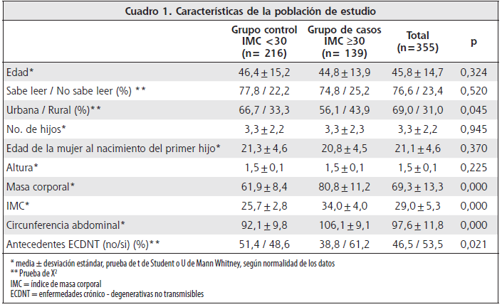 La población de estudio se formó con un total de 355 mujeres. El 22,2 % fue clasificado con normopeso (IMC=22,7±1,6), el 38,6 % con sobrepeso (IMC=27,5±1,5), el 26,2 % se encuentra clasificado con obesidad I (IMC=31,7±1,3), el 9,9 % con obesidad II (IMC=36,9±1,5) y el 3,1 % con obesidad III (IMC=43,9±5,8). El grupo control se formó con el 60,8 % de la población estudiada (IMC normal y sobrepeso) y el grupo de casos con el 39,2 % (IMC obesidad I, II y III). No se observaron diferencias significativas entre los grupos respecto a la edad, el alfabetismo, número de hijos, edad de la mujer al nacimiento del primer hijo y altura. La proporción de mujeres con obesidad de procedencia rural fue significativamente mayor a la urbana (43,9 % y 33,3 %, respectivamente). Todas las mujeres son de estatura baja, pero la población del grupo de casos presentó una masa corporal, circunferencia abdominal e IMC significativamente mayor al grupo control. Se identificó que una proporción de mujeres del grupo de casos, presenta significativamente más familiares con enfermedades crónico - degenerativas (madre o padre con diabetes o hipertensión arterial) que el grupo control (61,2 % y 48,6 %, respectivamente; Cuadro 1).