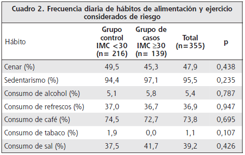 Los hábitos de cenar, practicar alguna actividad deportiva, el consumo de alcohol, bebidas carbonatadas, café, tabaco y sal, fueron similares entre ambos grupos (Cuadro 2). Al respecto, a pesar de que no se identificaron diferencias significativas, de manera general es importante señalar que un grupo considerable de mujeres (47,9 %), a diario consume alimentos en la noche y casi la totalidad no realiza alguna actividad física (95,5 %), así como ha sustituido la ingesta de agua natural por refrescos carbonatados industrializados (36,9 %), además de consumir con frecuencia café endulzado con azúcar (73,8 %) y agregar sal a sus alimentos previo a su ingestión, adicional a la añadida durante su cocción y preparación (39,2 %).