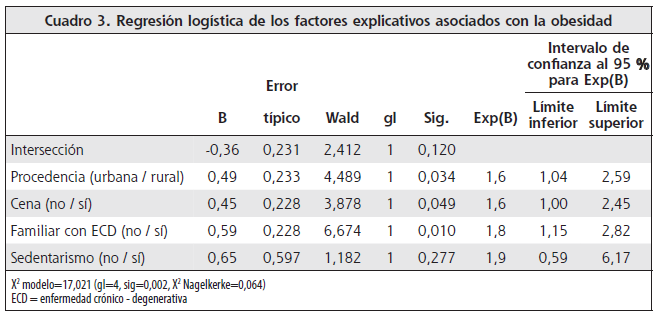 El modelo de regresión logística muestra que la procedencia rural, el hábito de cenar y el antecedente de enfermedades crónico - degenerativas en familiares directos, fueron estadísticamente significativos para explicar la obesidad entre la población femenina estudiada. Una mujer originaria de una comunidad rural fue 1,6 más propensa a la obesidad; el hábito de cenar también aumentó en 1,6 veces el riesgo de obesidad. Las mujeres con antecedentes familiares directos de enfermedades crónico - degenerativas tuvieron 1,8 veces más riesgo de obesidad. La falta de actividad física aumentó el riesgo 1,9 veces, pero este resultado no fue estadísticamente significativo (Cuadro 3).