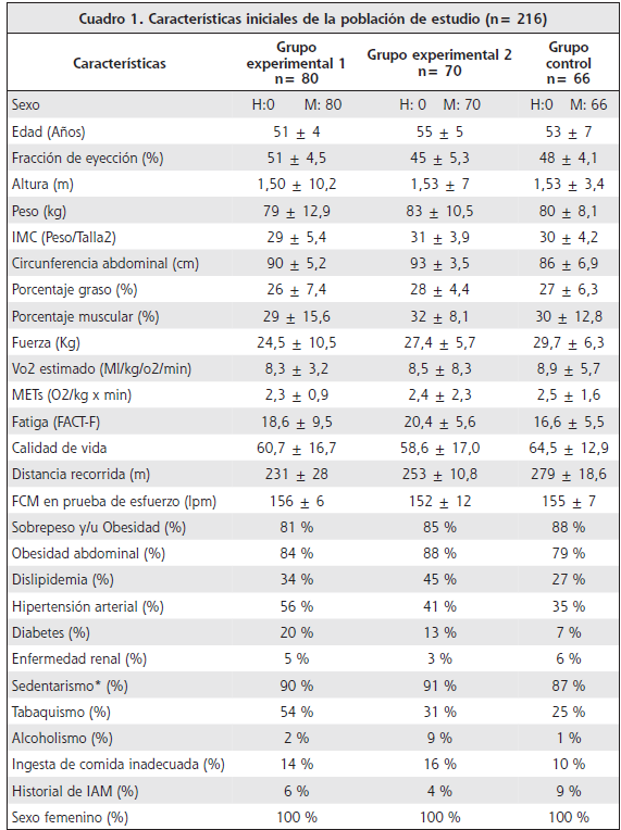 Los pacientes tenían particularidades semejantes desde el punto de vista de: etapa del cáncer, fracción de eyección, clase funcional, porcentaje muscular, grasa e IMC (índice de masa corporal), circunferencia abdominal, sobrepeso, obesidad, prevalencia de diabetes, hipertensión arterial (HTA), factores de riesgo cardiovascular. También, todos los individuos mostraron “riesgo alto”, según la estratificación propuesta por la Asociación Americana de Rehabilitación Cardiopulmonar.