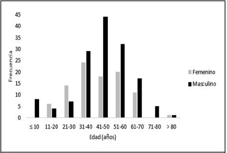 La mediana de edad correspondió a 45 años en ambos sexos, con un rango de 1 a 81 años. La distribución global de la prevalencia se da en la quinta década de vida, en el caso de los hombres se mantiene dicha prevalencia, y en las mujeres, en la cuarta década de vida, como se muestra en la Figura 1.