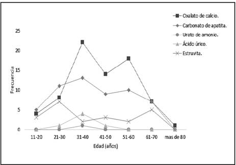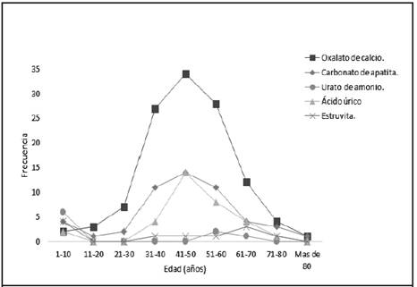Resultados: Hay una mayor prevalencia de litiasis renal en hombres (62 %), en comparación con las mujeres (38 %). La mediana de presentación de la litiasis renal fue de 45 años. Se presentó en la quinta década de edad en hombres y en la cuarta década de edad en mujeres. Los compuestos oxalato de calcio, carbonato de apatita, ácido úrico y estruvita fueron los más prevalentes en litiasis renal.