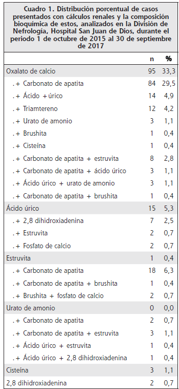 De seguido están los conformados por carbonato de apatita (43 % de los casos), ácido úrico (17 % de los casos) y estruvita (13 % de los casos). Se tiene 116 pacientes que presentaron cálculos renales formados de un solo compuesto (41 % de los casos), 146 pacientes con litiasis renal formada de dos compuestos (51 % de los casos) y 23 pacientes con litiasis renal conformada por tres compuestos (8 % de los casos). En aquellos casos de litiasis renal con dos componentes, se tiene una mayoría de casos de oxalato de calcio combinado con carbonato de apatita, triamtereno y ácido úrico. En los casos de litiasis renal de conformación triple, hay un predominio de oxalato de calcio, estruvita y apatita. Las frecuencias de la composición de los cálculos renales se muestran en el cuadro 1.