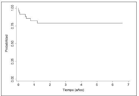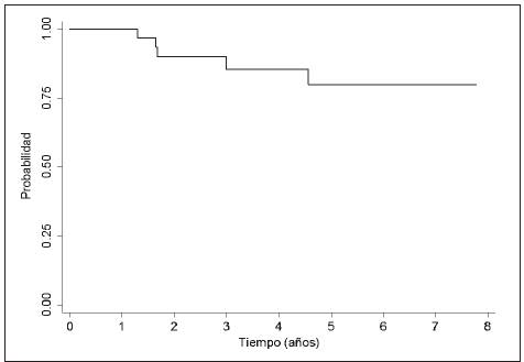 Para el análisis de la supervivencia libre de enfermedad, se excluyó a 7 / 42 pacientes, cuyo final del tratamiento acontecía tras terminar el estudio, y la recaída ocurrió en un 20,0 %; es decir, se registró en 7 / 35 pacientes en estudio. La supervivencia libre de enfermedad para 35 / 42 pacientes incluidos en este estudio fue del 78,8 %, tanto a los 3 como a los 5 años (Figura 2).