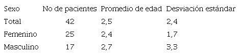 Se estudió un total de 42 pacientes con diagnóstico histológico de tumor de Wilms, distribuidos por sexo, 25 (59,5%) eran mujeres y 17, varones (40,5 %).
