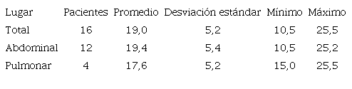 Con radioterapia externa, a nivel abdominal los pacientes recibieron una dosis irradiada promedio de 19,0 ± 5,2 Gy; el rango de dosis estuvo entre 10,5 Gy y 25,2 Gy; a nivel del área pulmonar, la dosis promedio fue de 16,5 ± 5,2 Gy, y el rango de dosis estuvo entre 15,0 Gy y 25,5 Gy (Cuadro 2). Además, por las características clínicas del tumor y como parte de su tratamiento, un paciente recibió un “Boost“ con 10,8 Gy, en la zona paraórtica.