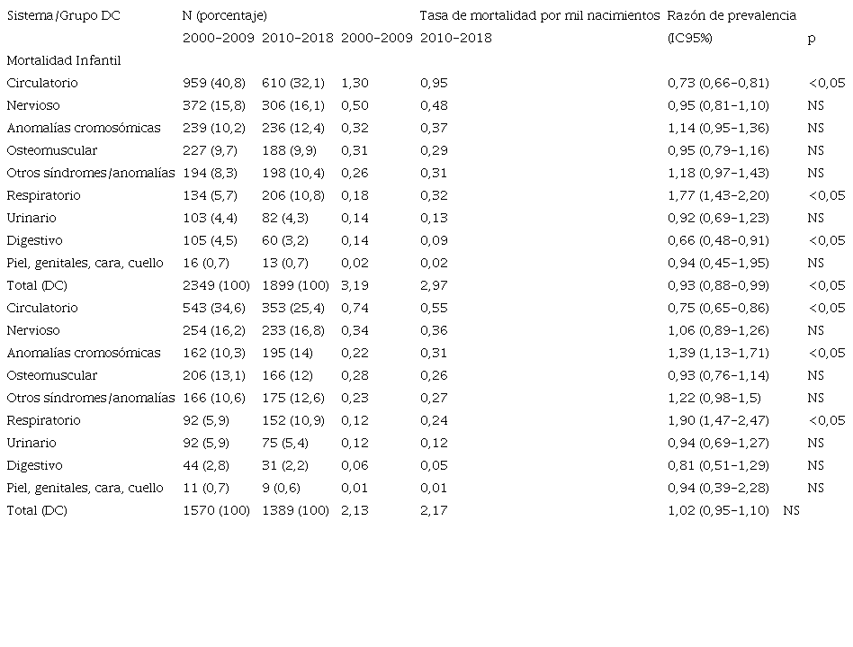 Results.: In the last two decades, birth defects caused 29% to 38% of overall infant mortality. The infant mortality rate due to congenital defects during 2000-2009 was 3.19 (95% CI: 3.06-3.32) and presented a significant decrease to 2.97 (95% CI: 2.84-3.11) in the 2010-2018 period. This decrease occurred at the expense of the affection of circulatory and digestive systems. When analyzing infant mortality due to specific congenital defects, a significant decrease was shown only in spina bifida and some cardiac defects: transposition of the great arteries, ventricular septal defect, aortic coarctation and other unspecified cardiac anomalies. The neonatal mortality rate due to congenital defects did not vary significantly between the periods compared, in 2000-2009 it was 2.13 (95% CI: 2.03-2.24) and 2.17 (95% CI: 2.06-2, 29) in 2010-2018. The only group of congenital defects that presented a significant decrease in the neonatal mortality rate in the last decade was the circulatory system.
