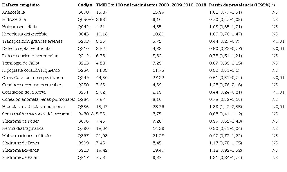 En el cuadro 2 se observa el cambio en la TMI según DC específico; se identificó un descenso significativo en la causalidad por algunos defectos cardiacos como transposición de grandes arterias, defecto septal ventricular, coartación de la aorta y otras anomalías cardiacas no especificadas. No aparecen algunos otros DC que presentaron cambios significativos, porque el número de defunciones fue menor a 50 como límite establecido. Sin embargo, entre estos últimos, la espina bífida presentó una disminución significativa en la TMI (p <0,05) de 2,58 a 1,10 por 100 mil nacimientos (RP: 0,42; disminución de 58%); mientras que otros DC presentaron un aumento significativo (p <0,01) de su TMI, como lo fueron la gastrosquisis que pasó de 1,36 a 4,69 x 100 mil nacimientos (RP: 3,46; aumento de 246%), los gemelos siameses de 0,41 a 2,82 x 100 mil nacimientos (RP: 6,92; aumento de 592%) y el código Q870-8 que corresponde a “otros síndromes especificados” cuya TMI pasó de 2,04 a 5,16 x 100 mil nacimientos (RP: 2,54; aumento de 154%). La hipoplasia y displasia pulmonar también presentó un aumento significativo (cuadro 2).
