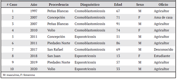 Methods: A series of cases is described based on the review of clinical records of patients diagnosed with sporotrichosis and chromoblastomycosis in the Dermatology service of the Carlos Luis Valverde Vega Hospital located in San Ramón canton from 1997 to 2020.