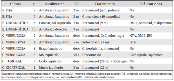 Resultados: 4 esporotricosis y 6 cromoblastomicosis predominaron en agricultores de edad avanzada. Se identificó en igual número la variante fija y la linfangítica de esporotricosis; en la cromoblastomicosis predominó la variante verrugosa de la enfermedad.