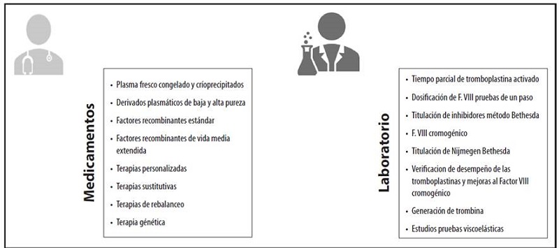 Los cambios tan significativos observados en la última década representan un enorme desafío para los laboratorios especializados, los cuales de- ben contar con profesionales expertos en coagulación sanguínea, pues en la actualidad se hace imprescindible utilizar nuevas metodologías, como la dosificación del FVIII cromogénico bovino y la titulación de los inhibidores por el sistema cromogénico Nijmegen Bethesda, en caso de que los pacientes estén siendo tratados con anticuerpos monoclonales. Los controles de laboratorio son esenciales para los hemofílicos tratados con productos recombinantes de vida media prolongada. En este caso, es crucial confirmar la idoneidad de los reactivos de diagnóstico tanto para la evaluación periódica como para realizar ajustes si es necesario. Esto evita la subestimación o sobrestimación de los niveles de actividad de los factores deficitarios, lo que podría poner en peligro a los pacientes al exponerlos a riesgos de sangrado o incluso trombosis. Además, no debe dejarse de lado la implementación de nuevas pruebas de laboratorio como la viscoelasticidad y las de generación de trombina, con el fin de complementar el seguimiento del tratamiento de los pacientes en condición de hemofilia.