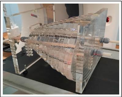 Para comprobar el control automático de exposición, se utilizó un maniquí compuesto por una serie de secciones elípticas de polimetacrilato de metilo, cada una de 2.5 cm de espesor con dimensiones que van desde 11.7 cm x 17.5 cm hasta 28.6 cm x 42.9 cm (Figura 1). El maniquí tiene marcas centrales y pies ajustables para permitir una alineación reproducible con los láseres del tomógrafo en todas las direcciones y garantizar que esté nivelado con su eje central alineado con el isocentro.4 Cada sección contiene un orificio central donde se ubica la cámara de ionización tipo lápiz para medir la magnitud empleada en este estudio: producto de dosis longitud (DLP).