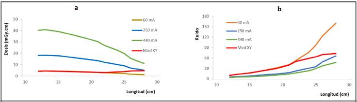 Con los parámetros de exploración predeterminados para el protocolo de abdomen y con el sistema de modulación activado, el ruido varía cerca de un factor de 7 desde la sección más pequeña hasta la sección de mayor longitud del maniquí. Es importante señalar que, a pesar de obtener menor ruido, con valores de 250 mA y 440 mA, los valores de dosis son muy superiores a los valores que se logran con el CAE activado.