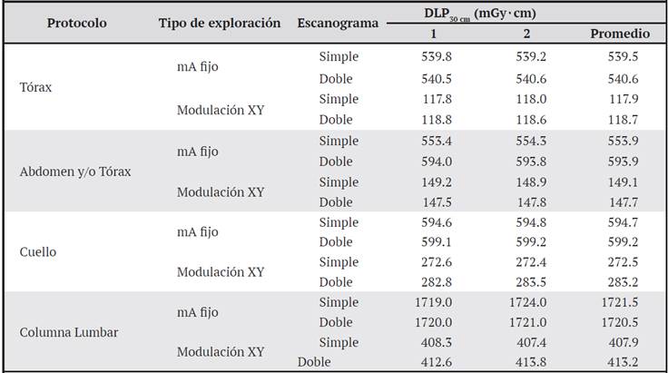 En el Cuadro 2 se muestran los resultados de las dosis medidas, según el tipo de escanograma (simple o doble) para los diferentes protocolos, con intensidades de corrientes fijas y modulación XY.