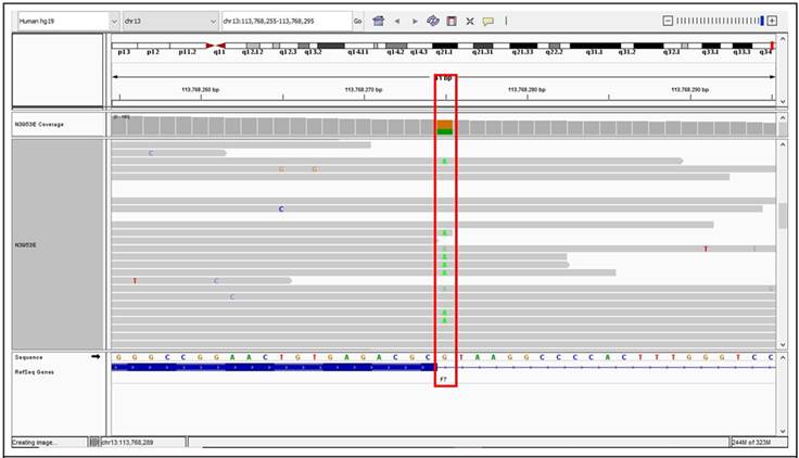 Se le solicitó una tomografía axial computarizada urgente que evidenció hemorragia en sistema nervioso central a nivel frontal derecho, motivo por el cual se le realizó una craneotomía con hemilobectomía frontal derecha. Debido a esta manifestación de sangrado grave, se tomó la decisión de iniciar profilaxis con rFVIIa diaria hasta la resolución del sangrado cerebral. A los 2 meses y 10 días, se le realizaron estudios moleculares basados en secuenciación masiva de nueva generación (NGS por sus siglas en inglés). El análisis determinó dos variantes heterocigotas: F7, intrón 5, c.430+1G>A y F7, intrón 8, c.805+1G>A, definidas en conjunto como patogénicas según los criterios PVS1, PMS2 y PP5 del American College of Medical Genetics. (Figura)7 Actualmente, el paciente continúa con profilaxis 5 días de la semana con rFVIIa 200 µg/ día IV (280 µg/kg) de lunes a viernes a través de catéter subclavio externo permanente. El paciente no ha vuelto a presentar ninguna manifestación de sangrado.