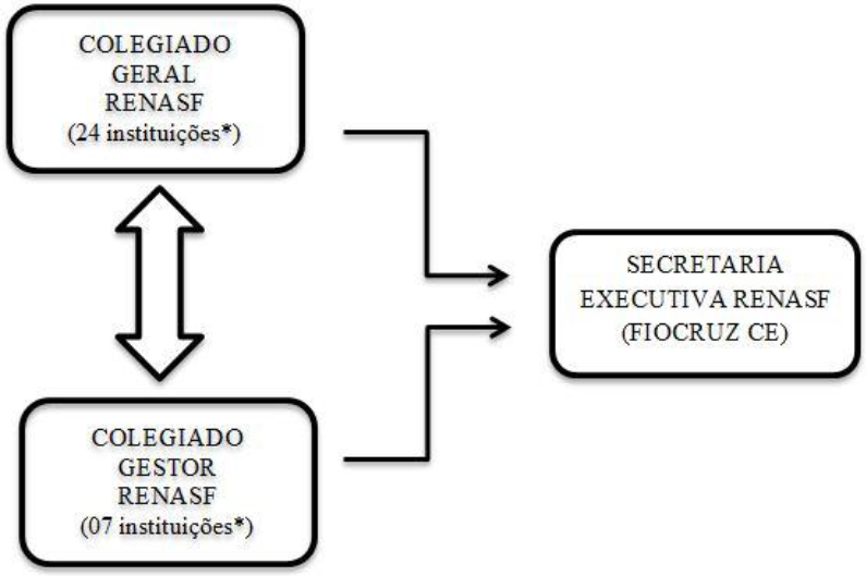 Com todas essas possibilidades de formação, os representantes das instituições da RENASF reuniram-se em março de 2015 para deliberar sobre a temática. Nesta ocasião, a proposta da Fiocruz foi aceita por unanimidade e a primeira composição do colegiado gestor da rede foi eleita, ficando composta por representantes da Fiocruz, Universidade Federal do Rio Grande do Norte (UFRN), Universidade Regional do Cariri (URCA), Escola de Formação em Saúde da Família Visconde de Sabóia (EFSFVS), Universidade do Vale do São Francisco (UNIVASF), Universidade Federal do Piauí (UFPI) e Conselho dos Secretários Municipais de Saúde (COSEMS) do Ceará. Neste mesma reunião, o regimento da RENASF foi aprovado com a incorporação do novo formato de governança da rede.